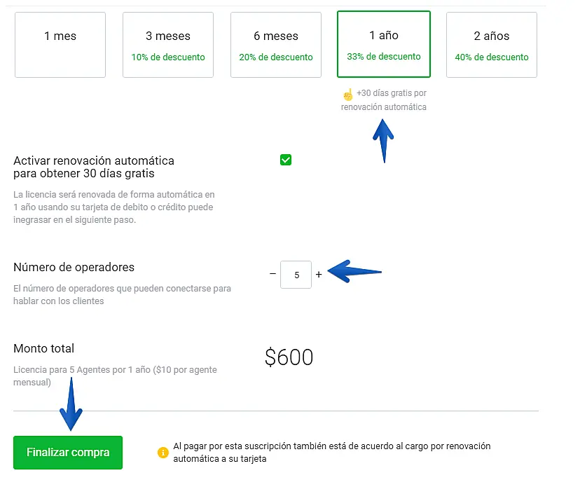 4. Seleccione el tiempo que desea tener activa la licencia, el número de agentes así:
