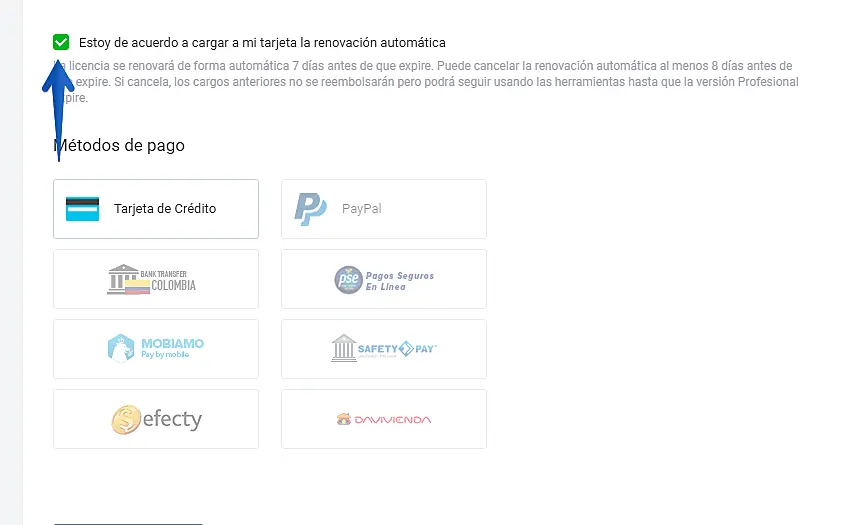 NOTA: en este paso puede seleccionar la renovación automática para que sea cargado a su tarjeta todos los meses
