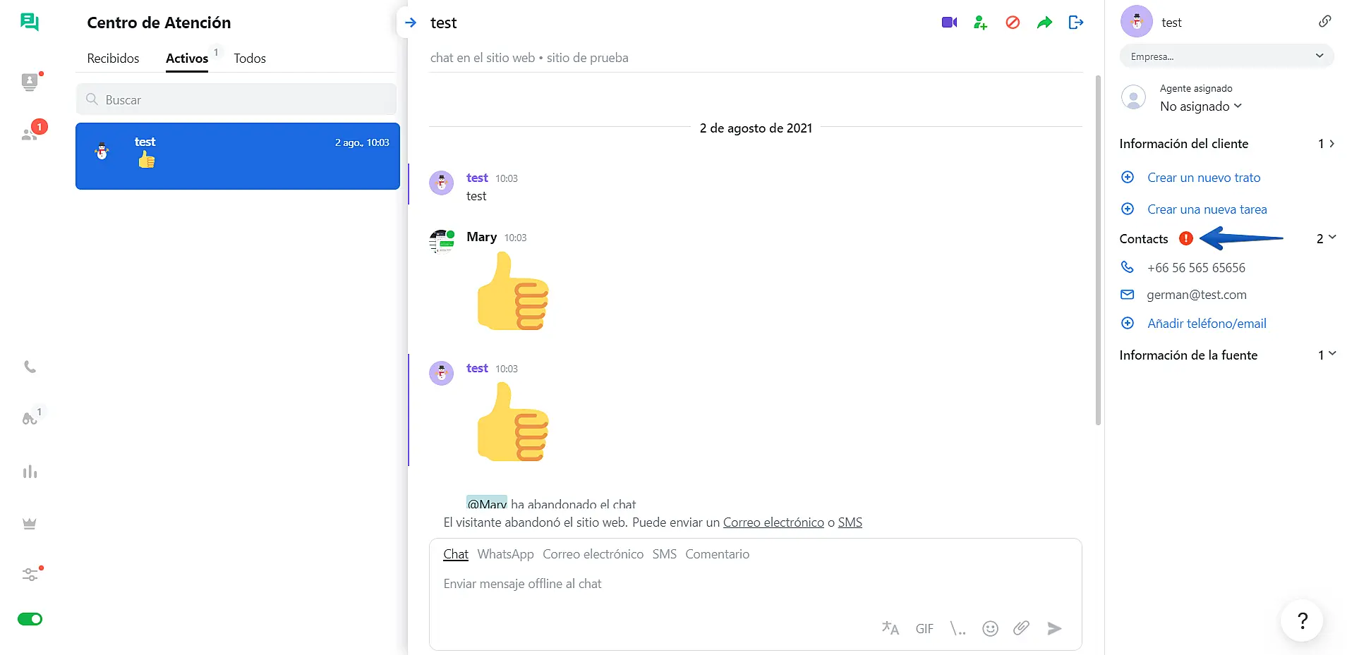 - Por ahora, solo podrá combinar clientes del canal "Chat para sitios web". No funcionará para redes sociales, email, etc.