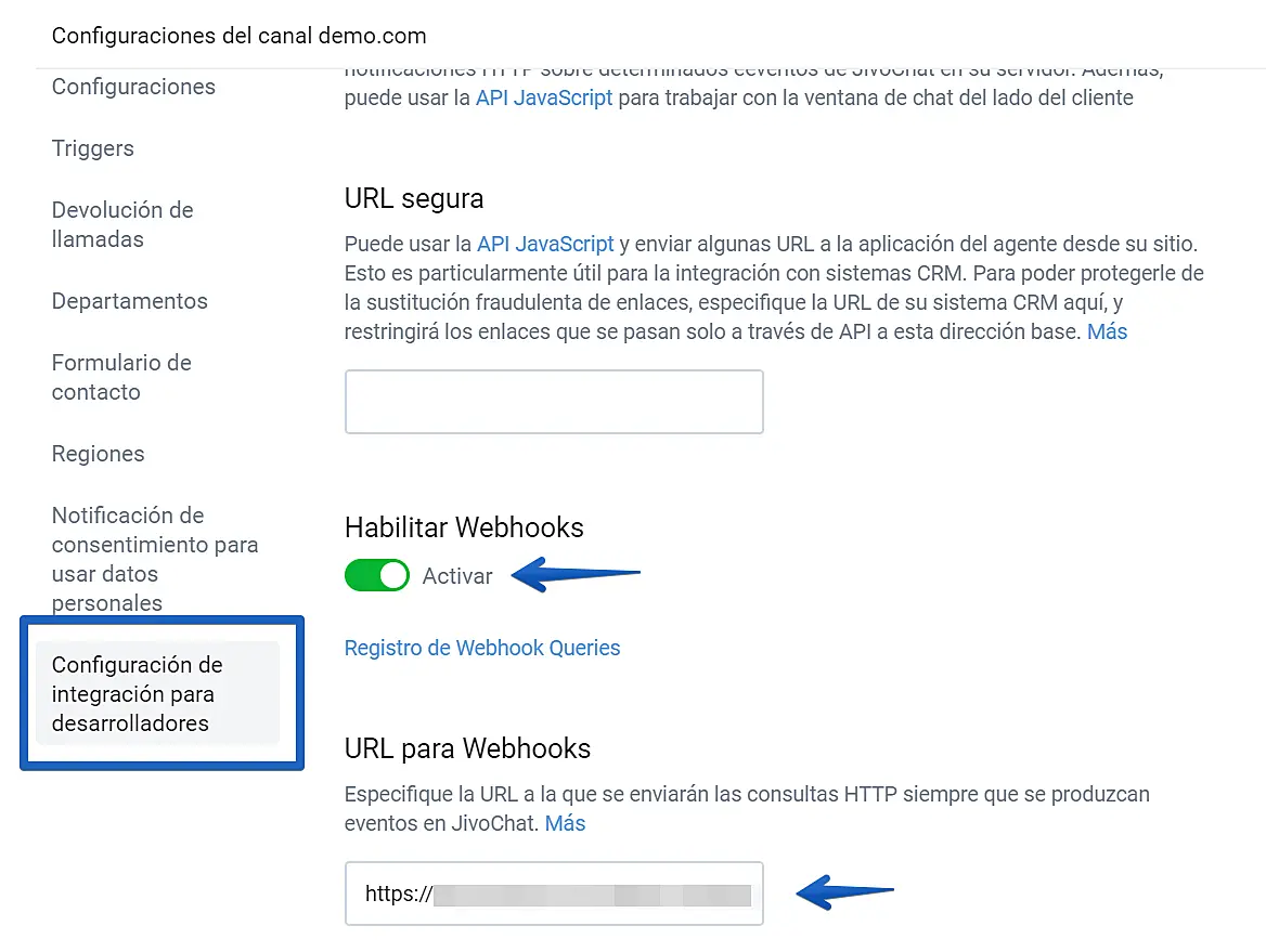 Ahora vaya al menú "Configuración de integración para desarrolladores", active la opción "habilitar webhooks" e inserte la URL en el campo de "URL para webhooks"