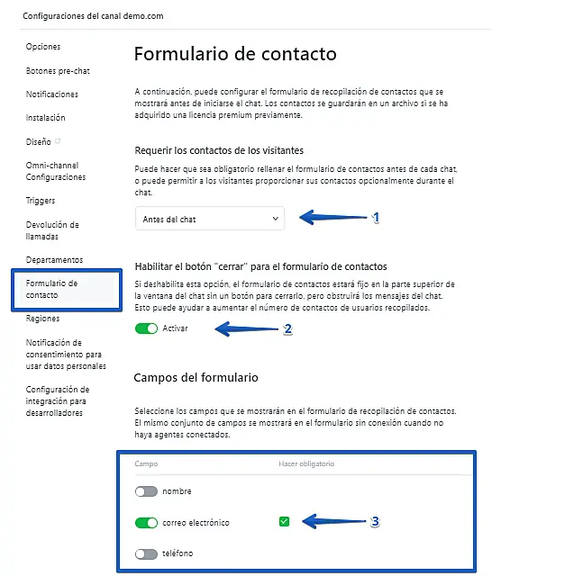- "Habilitar el botón cerrar" Fue diseñada para la opción "durante el chat" hará que el visitante no lo pueda cerrar y que quede fijo siempre en la parte superior del chat para solicitar los datos.