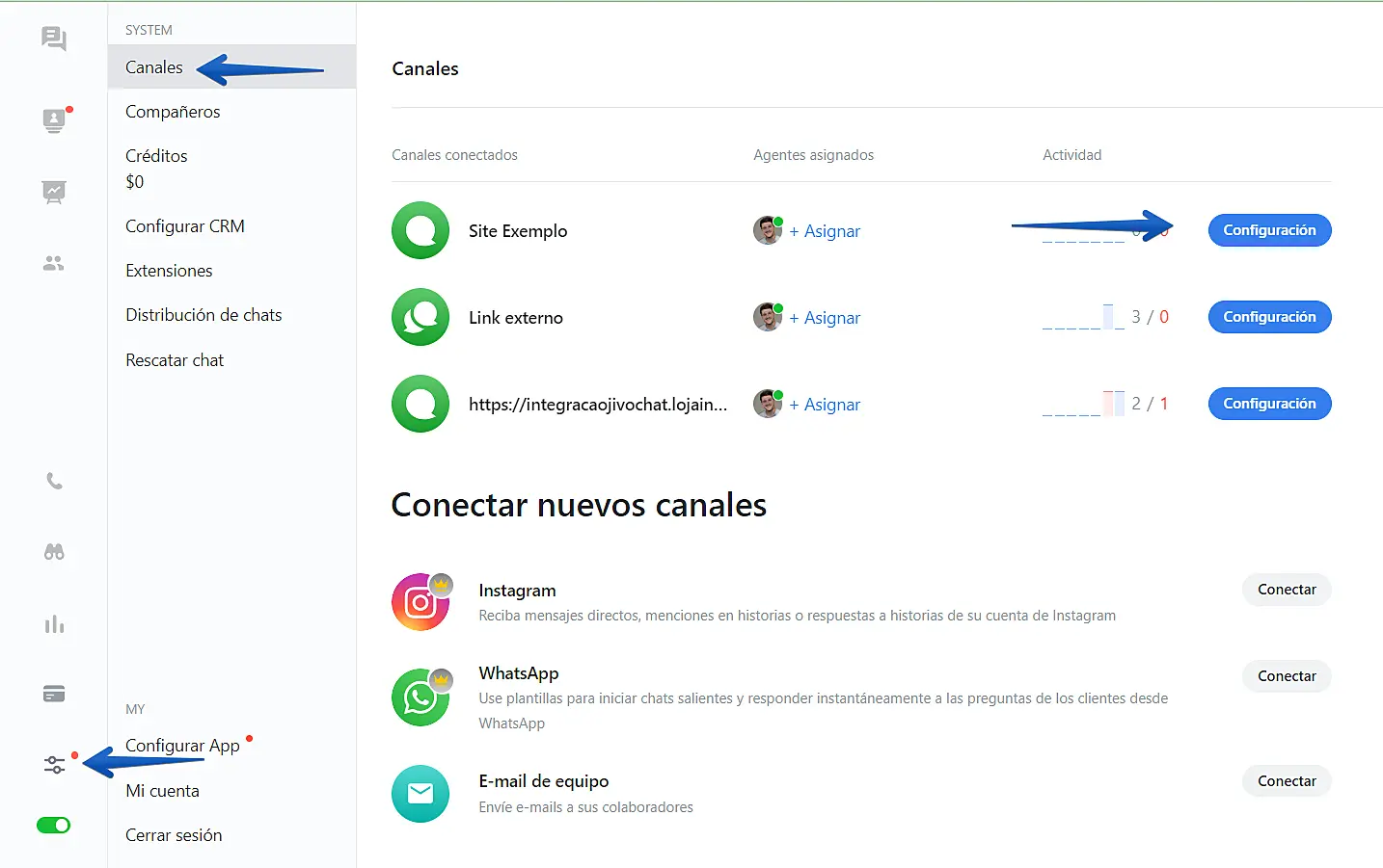 1. Abra la aplicación web o de escritorio de JivoChat. Vaya a Ajustes-> Canales-> Configuraciones (debajo del nombre del canal).