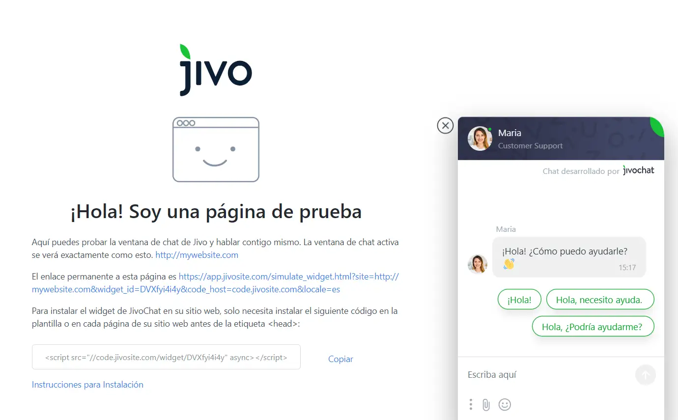 Cuando sigas este paso, verás una página de prueba y podrás empezar a interactuar contigo mismo para probar todas las funcionalidades, características y herramientas que ofrece JivoChat. Además, podrás navegar por la aplicación y ver las estadísticas en tiempo real y rastrear a los visitantes en línea a través de la pestaña "Visitantes".