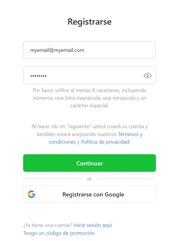 Paso 1. Ingrese la dirección de correo electrónico que quedará como correo de la cuenta de administrador y cree una contraseña. la contraseña debe contener una mayúscula y al menos un número