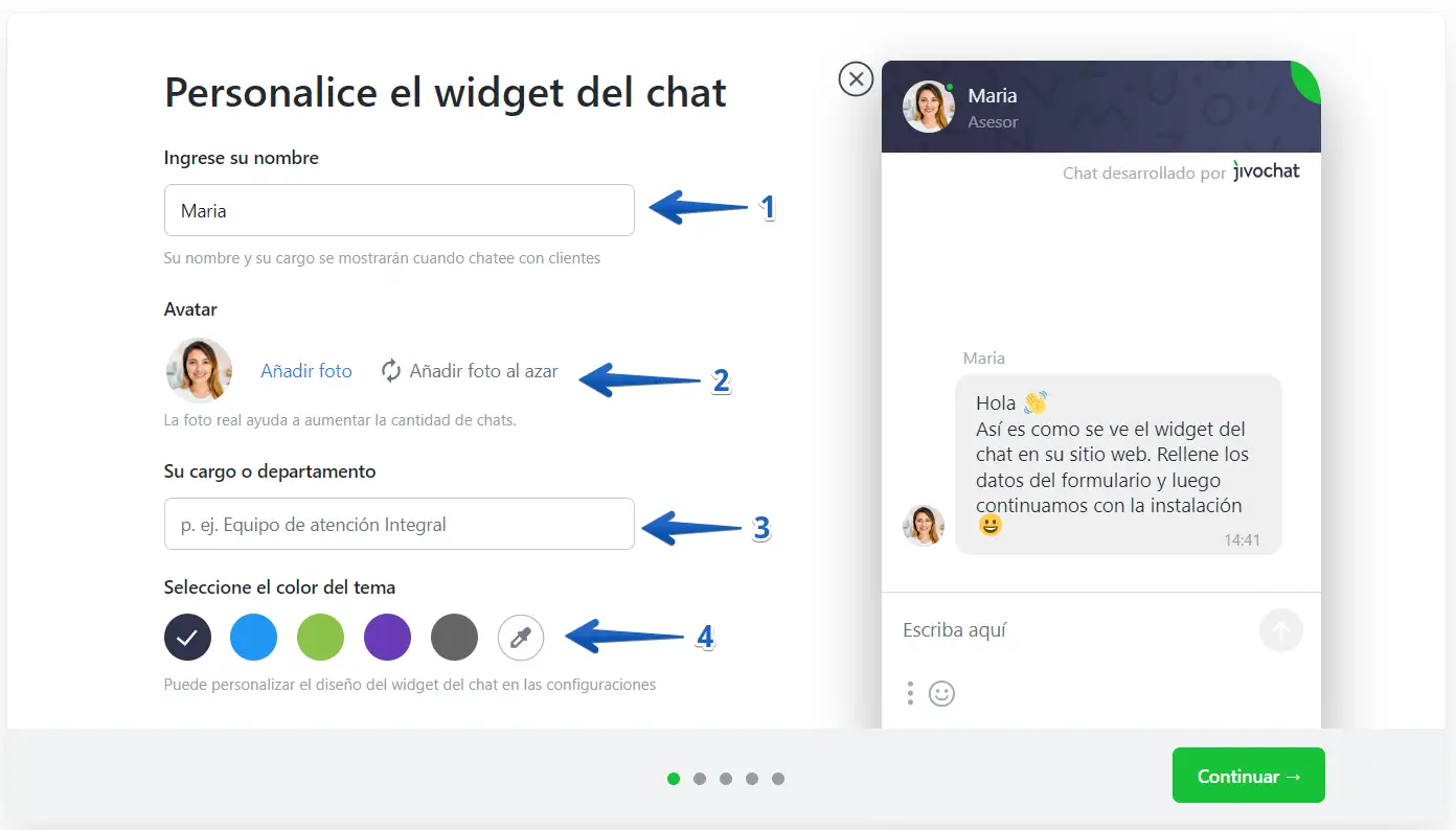 Paso 2. Ingresa tu nombre (1) correspondiente al correo electrónico de registro, tu avatar (2), tu puesto (3), y el color del tema (4) para el chat que se instalará en tu sitio web (estos detalles pueden ser cambiados dentro de la aplicación en cualquier momento). Una vez que hayas ingresado toda la información, haz clic en Continuar.