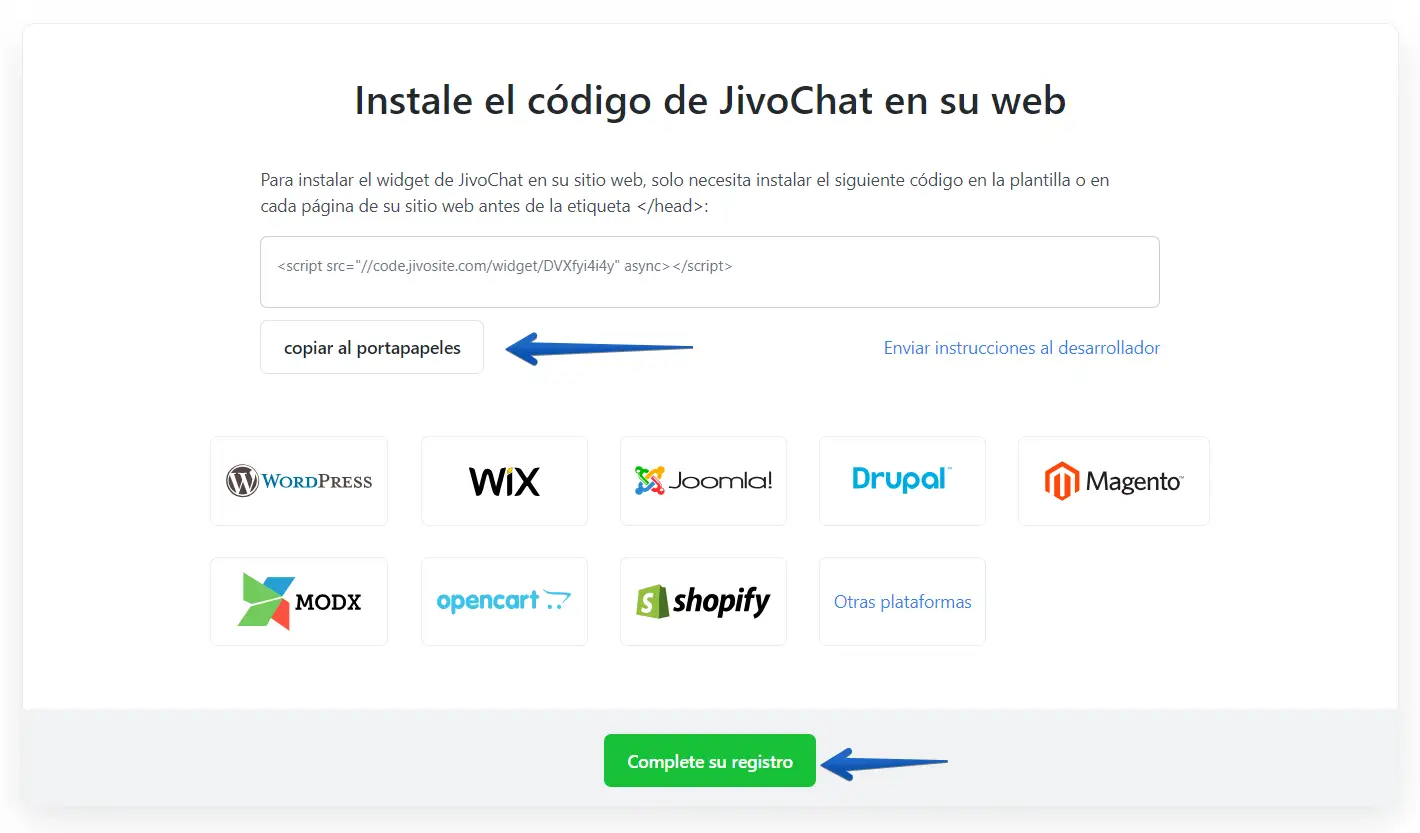 Paso 4. Esta es la etapa final del proceso de registro. Aquí puede copiar el código de chat para la instalación del sitio web o enviarlo al administrador del sitio web. Puede consultar nuestros tutoriales de instalación de códigos para los CMS (sistemas de gestión de contenido) más populares, que están disponibles en el siguiente link