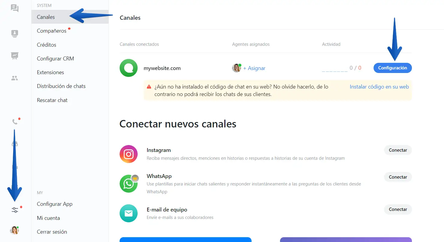 Si necesitas localizar el código de instalación después de haber completado el proceso de registro en nuestro sitio web, accede a la aplicación de JivoChat. Está disponible en cualquier momento en la sección Administrar, bajo Canales > Configuración del canal -> Instalación.