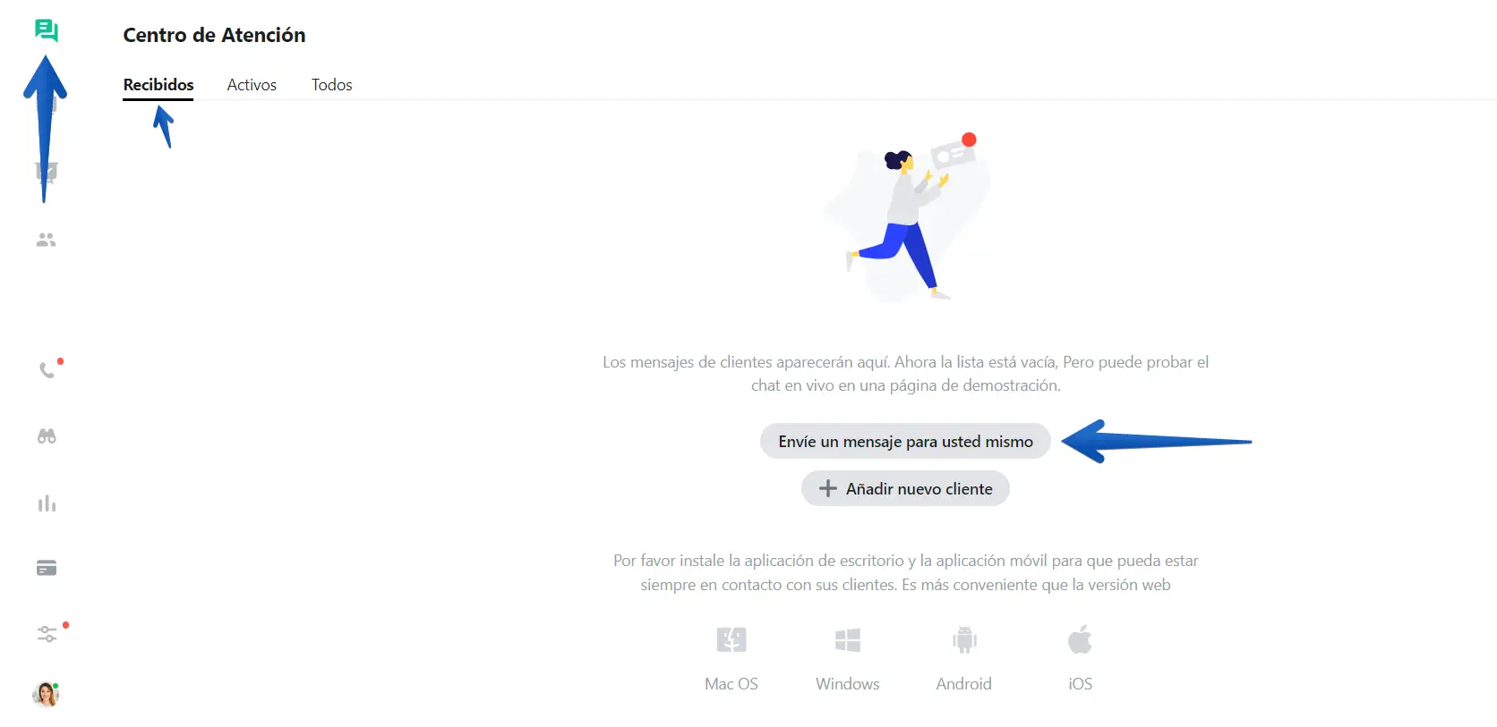 Después de que el widget esté instalado en el sitio web, puede comenzar a chatear con sus clientes utilizando Puedes probar tu primer chat en Centro de Atención > Recibidos > Envíe un mensaje pra usted mismo.