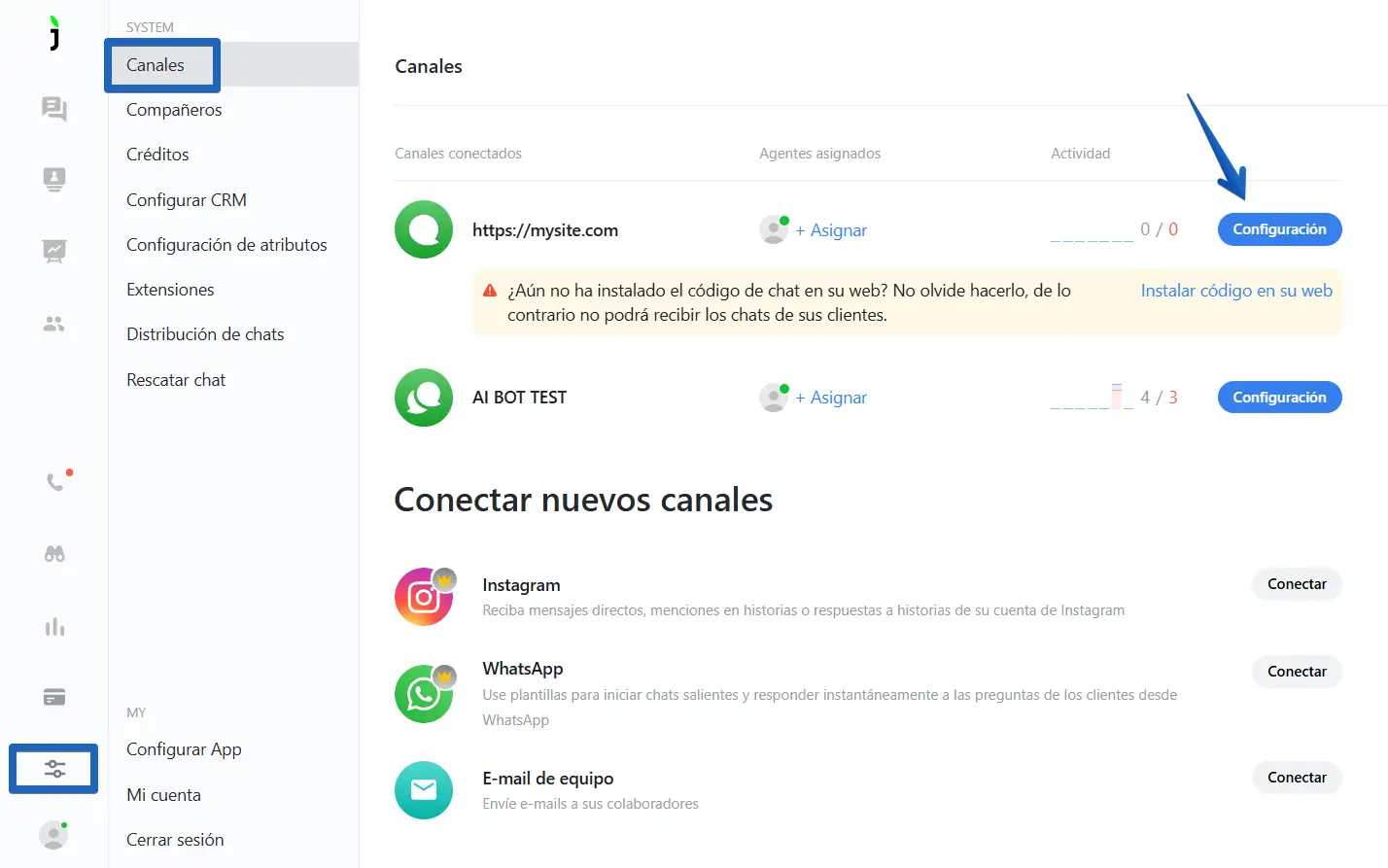 Si lo desea puede añadir un nuevo canal y copiar el código HTML del mismo. Puede ir a los "Ajustes"-> "Agregar canal"-> "Sitio web".