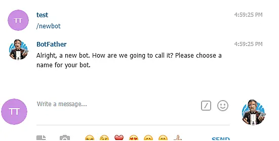 A continuación, va a necesitar el token API. Para para crear su Token de API y comenzar la integración, es necesario abrir Telegram, encontrar el usuario con el nombre de @botfather y comenzar una conversación con él. Después de esto, es necesario enviar el comando /newbot para crear un nuevo robot para una charla con @botfather