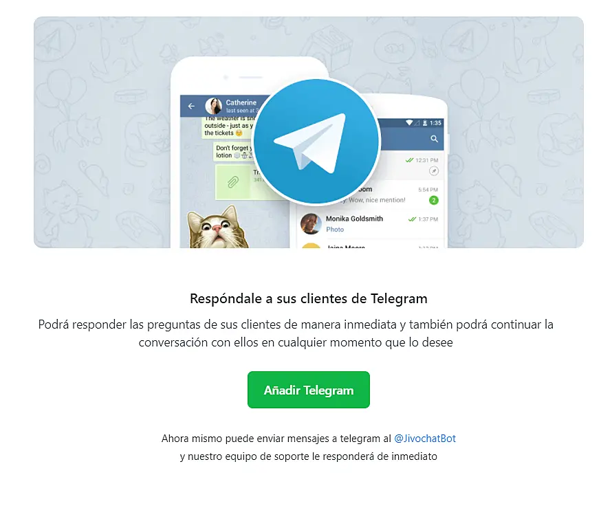 ¡Listo! Después de pulsar el botón "Habilitar servicio" estará activo, sus clientes podrán escribir en su nuevo robot a través de la aplicación de Telegram y los mensajes llegarán directamente a la aplicación de su agente de JivoChat!