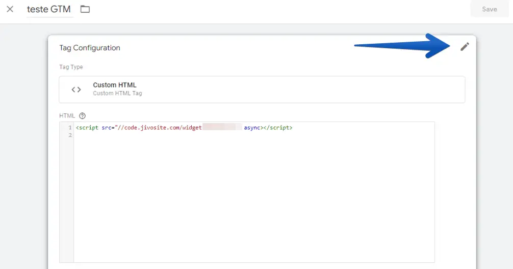 En la nueva versión del GTM se puede encontrar la configuración de esta forma, haga clic en el icono de lápiz: