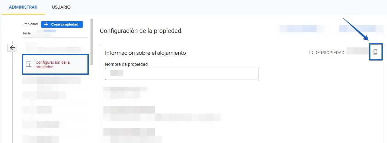 Para la opción "Google Analytics: configuración GA4", vuelva al panel de Analytics -> Haga clic en "Configuración de la propiedad" -> Copiar el ID de propiedad