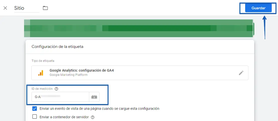 Luego regrese a GTM y pegue el ID -> Luego haga clic en "Guardar"