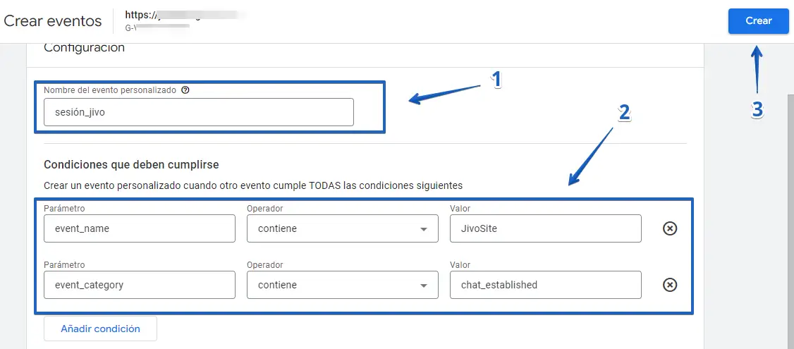 En la configuración, especifique el nombre del evento que aparecerá en los informes. Al usar una oración, debe agregar un guión ( - ) o el subrayado ( _ ) en lugar de un espacio.