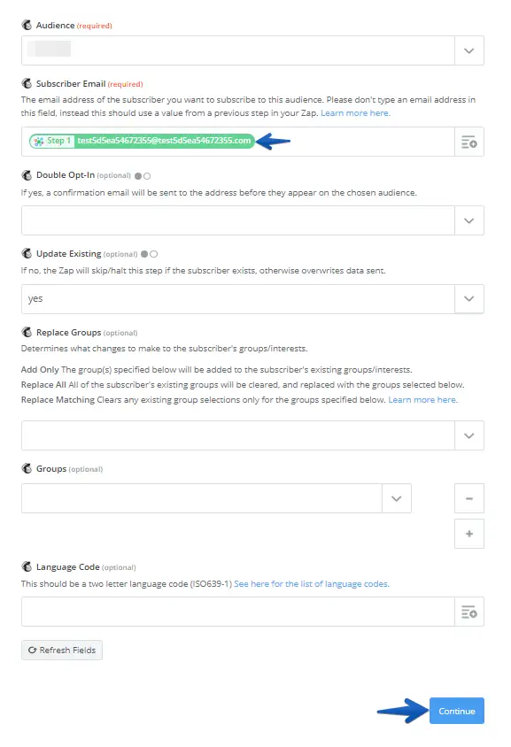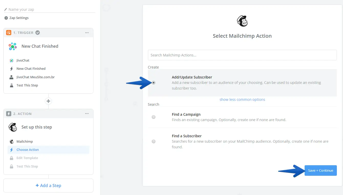 Seleccione la acción que desea y haga clic en "Save + Continue". En el ejemplo que se muestra en este tutorial, seleccionamos la acción más utilizada llamada "Add/Update Subscriber".