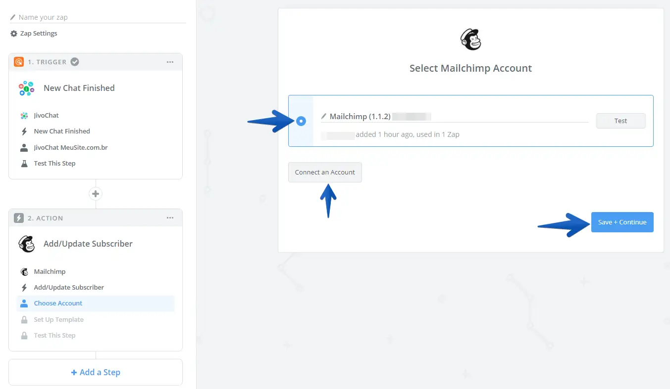Conecte su cuenta de MailChimp, seleccione de la lista y haga clic en "Save + Continue".