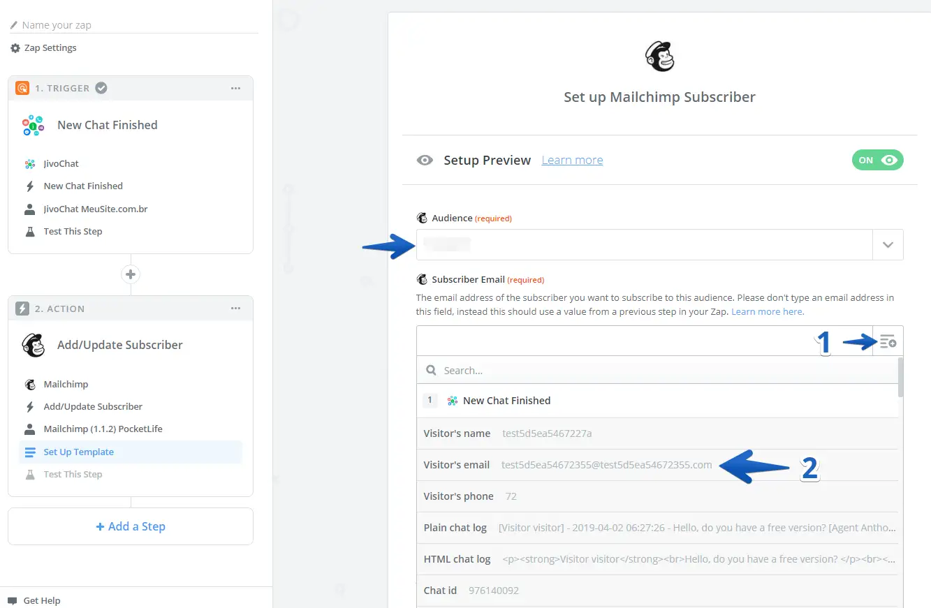 Configure la integración cómo prefiera, seleccione al menos el público (Audience) y en el campo del email del suscriptor (Subscriber Email) haga clic para seleccionar el campo de JivoChat (1) y seleccione el campo "Visitor's email" (email del visitante,2). En caso que quiera, puede seleecionar otros campos de JivoChat para ingresar en los campos opcionales que encontrará más abajo.