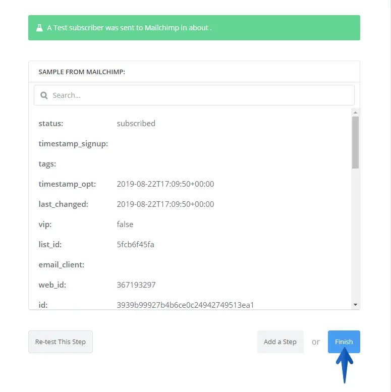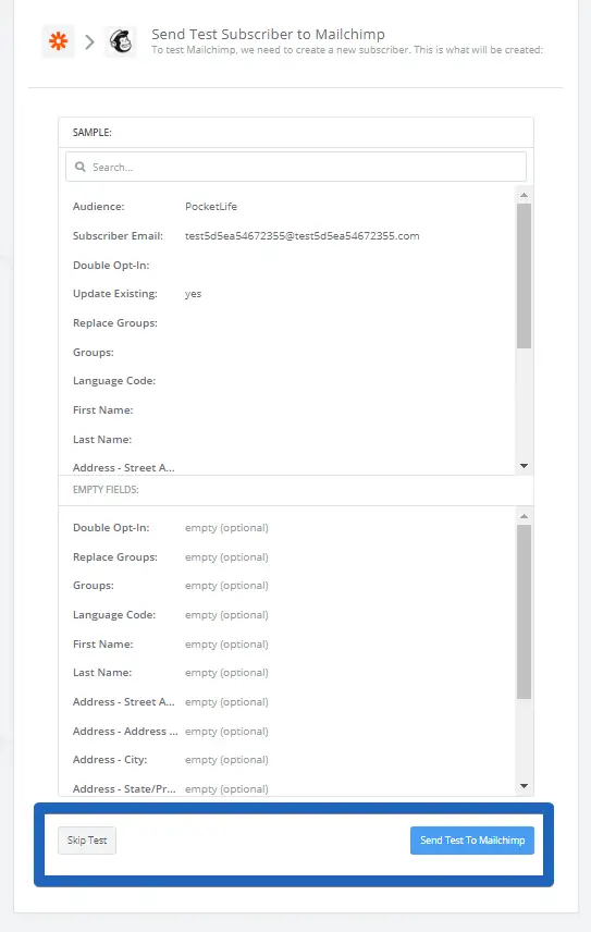 En el próximo paso, podrá enviar una prueba para MailChimp y ver cómo funciona, puede saltar este paso si está seguro de que ha quedado bien configurado.