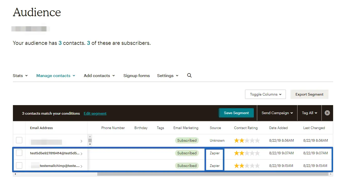 ¡Eso es todo! Ahora recibirá los datos seleccionados desde nuestro evento "chat_finished" directo en sus datos de audiencia en su cuenta de MailChimp. Los contactos que se generan en jivo, los cuales contengan al menos el correo electrónico de un visitante/clientes, generarán o actualizarán un contacto en su audiencia seleccionada en MailChimp.