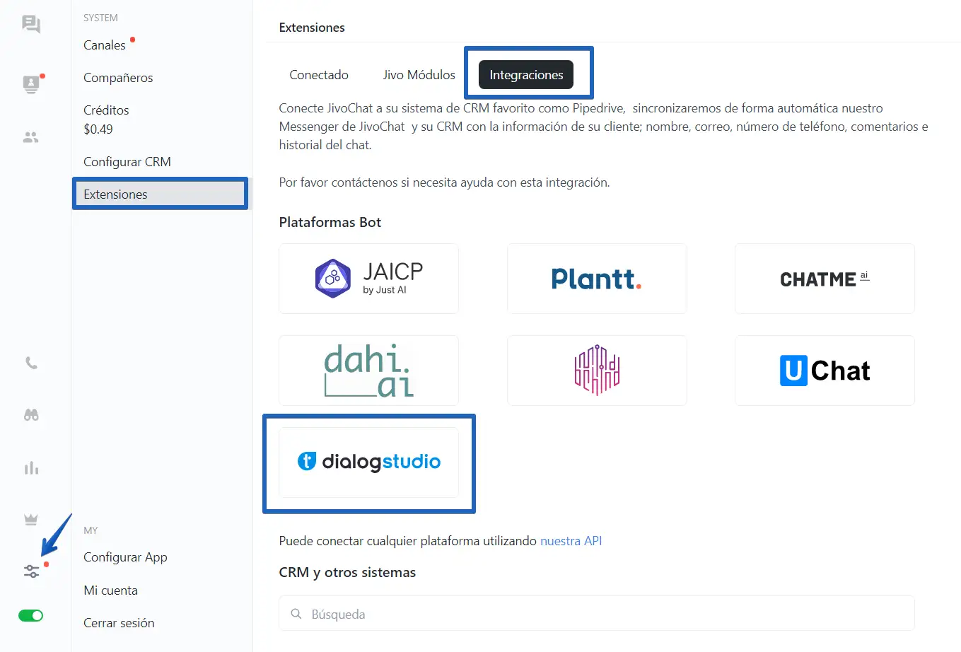 Cuando esté listo vaya a "Canales" seleccione "JivoChat" en el menú "Business channels".