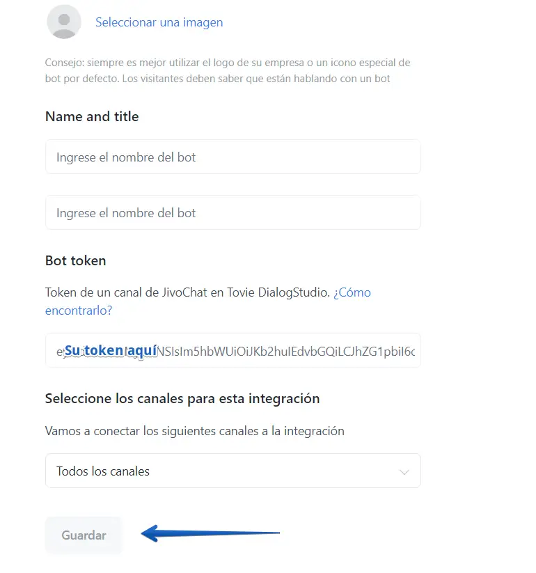 Escriba un nombre y título para su bot, añada una foto y pegue su "token" del bot. Seleccione los canales a los cuales quiere conectarlo y haga clic en "guardar".