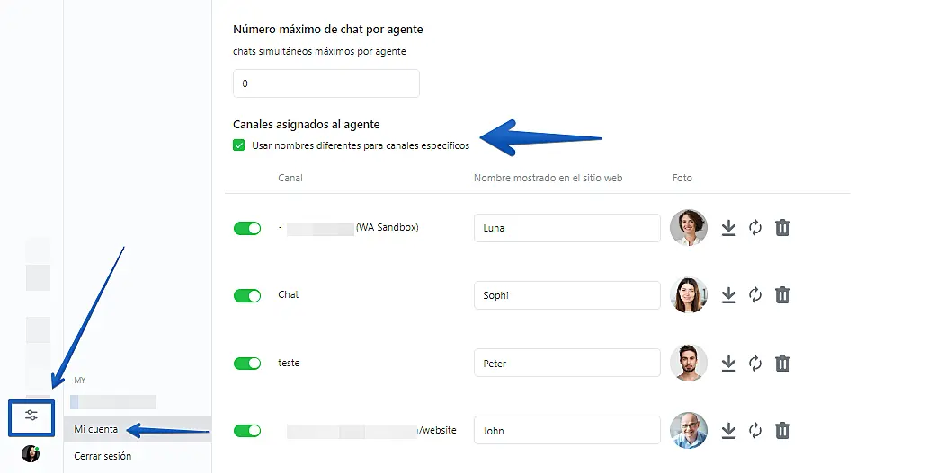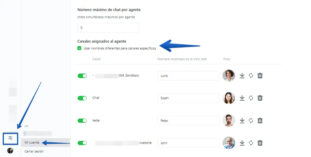 Comience iniciando sesión en su aplicación, haga clic en "Ajustes" -> "Mi perfil" -> Vaya a la sección "Canales asignados al agente" -> Haga clic en la casilla de verificación "Usar nombres diferentes para canales especificos" para activar la funcionalidad