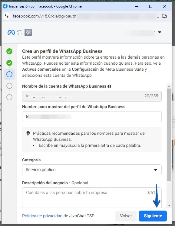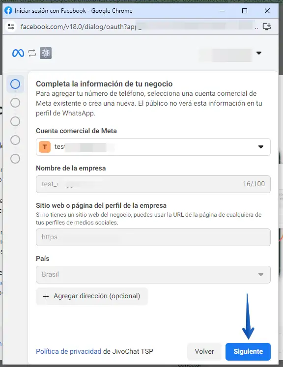 Elija una cuenta comercial de WhatsApp o cree una nueva y luego haga clic en "Siguiente"