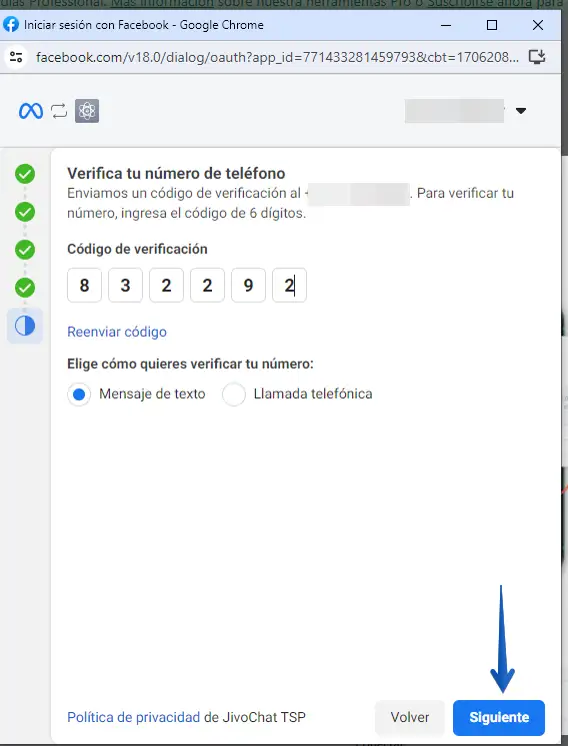 Añada su número de teléfono , elija cómo quiere verificarlo (via SMS o llamada) y haga clic en "Siguiente".