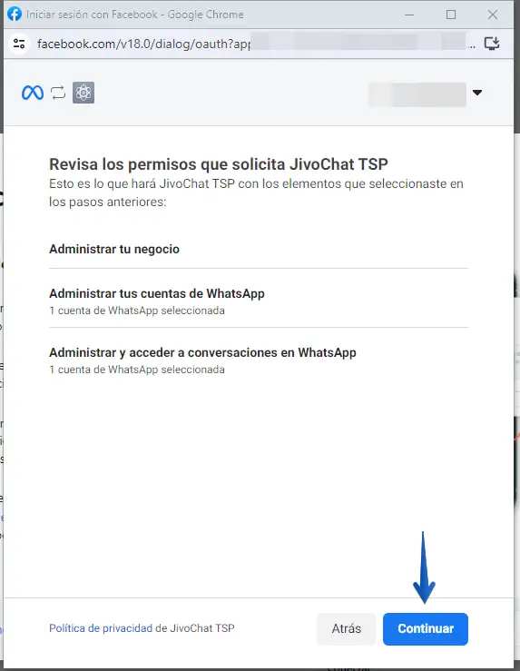 Haga clic en "Continuar" después de verificar todos los permisos solicitados: