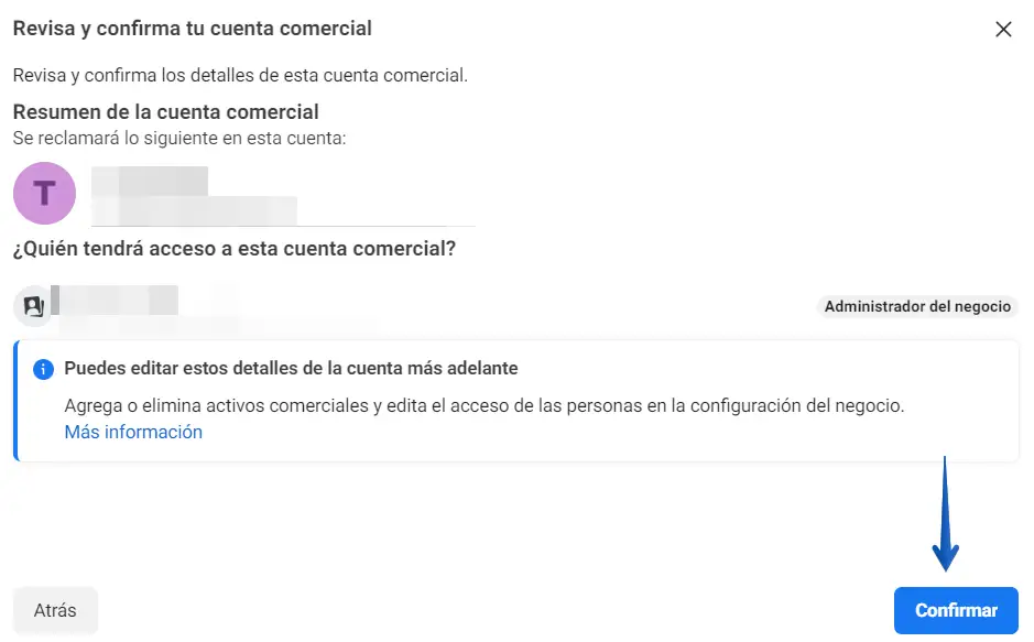 E - Revise y confirme su cuenta comercial haciendo clic en "Confirmar"