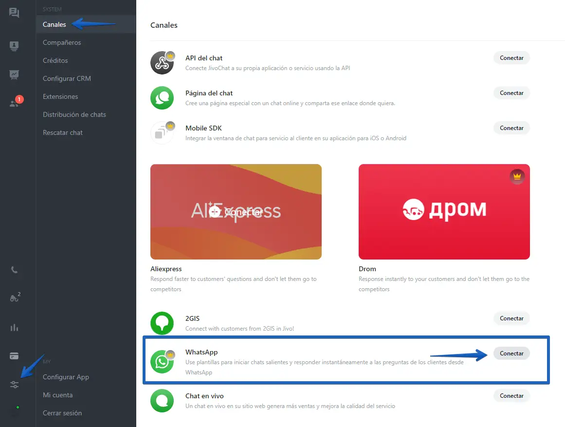 Abra la configuración de Canales y busque WhatsApp allí, luego haga clic en "Conectar".