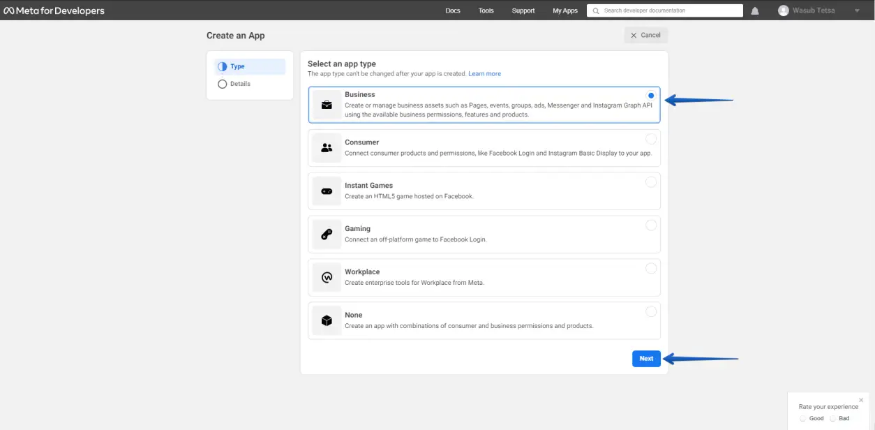 Haga clic en el mosaico de su aplicación dos veces, se abrirá la siguiente ventana. Ahora estamos comenzando a crear una cuenta comercial de Meta.