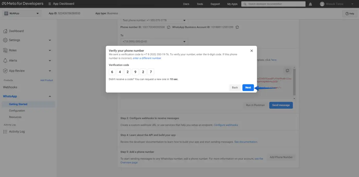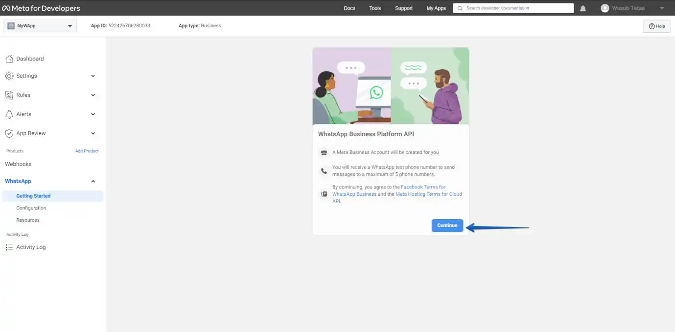En una nueva pestaña, vaya a https://developers.facebook.com/apps/ y en la barra de menú de la izquierda, haga clic en WhatsApp-> Configuración -> Configurar un webhook.