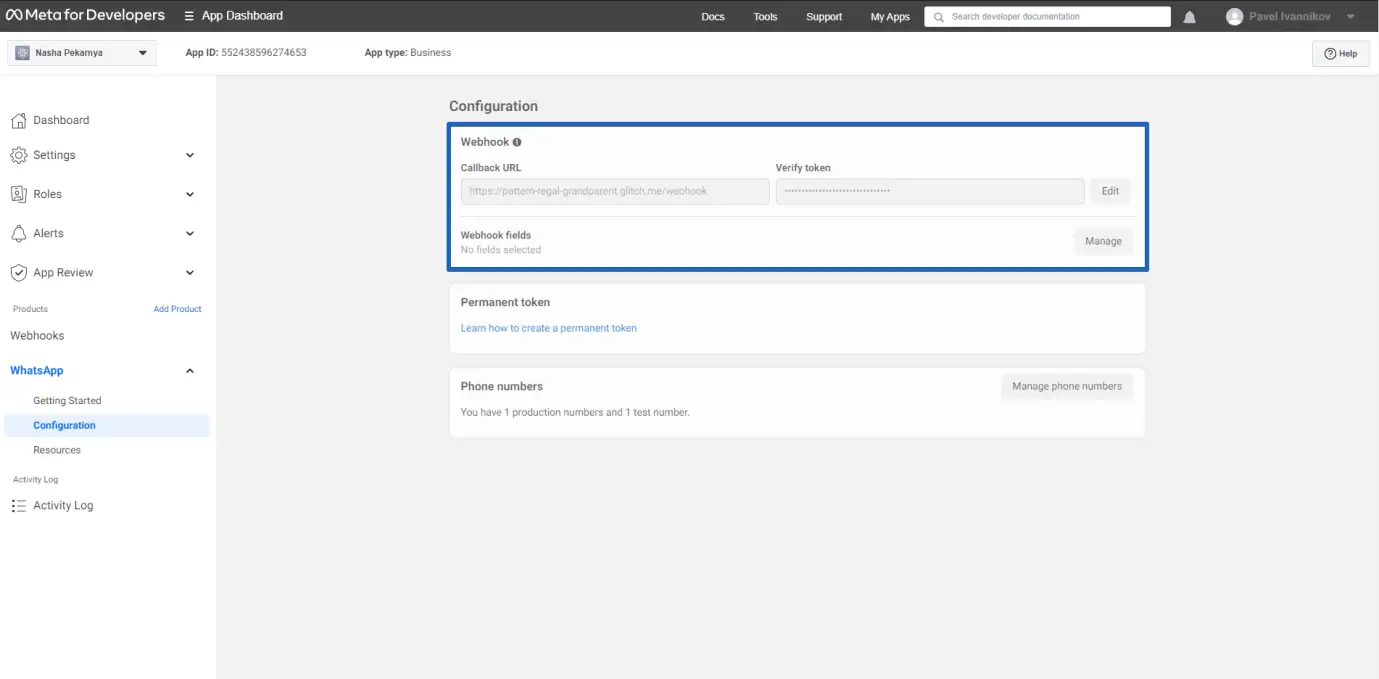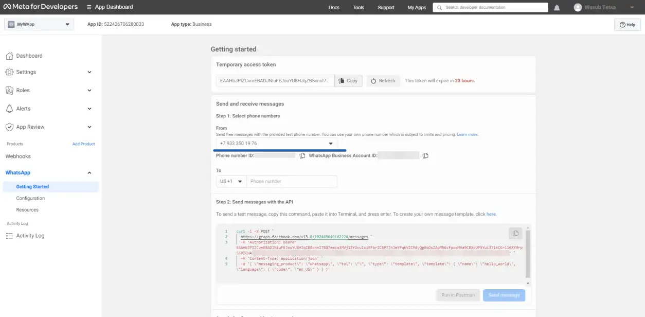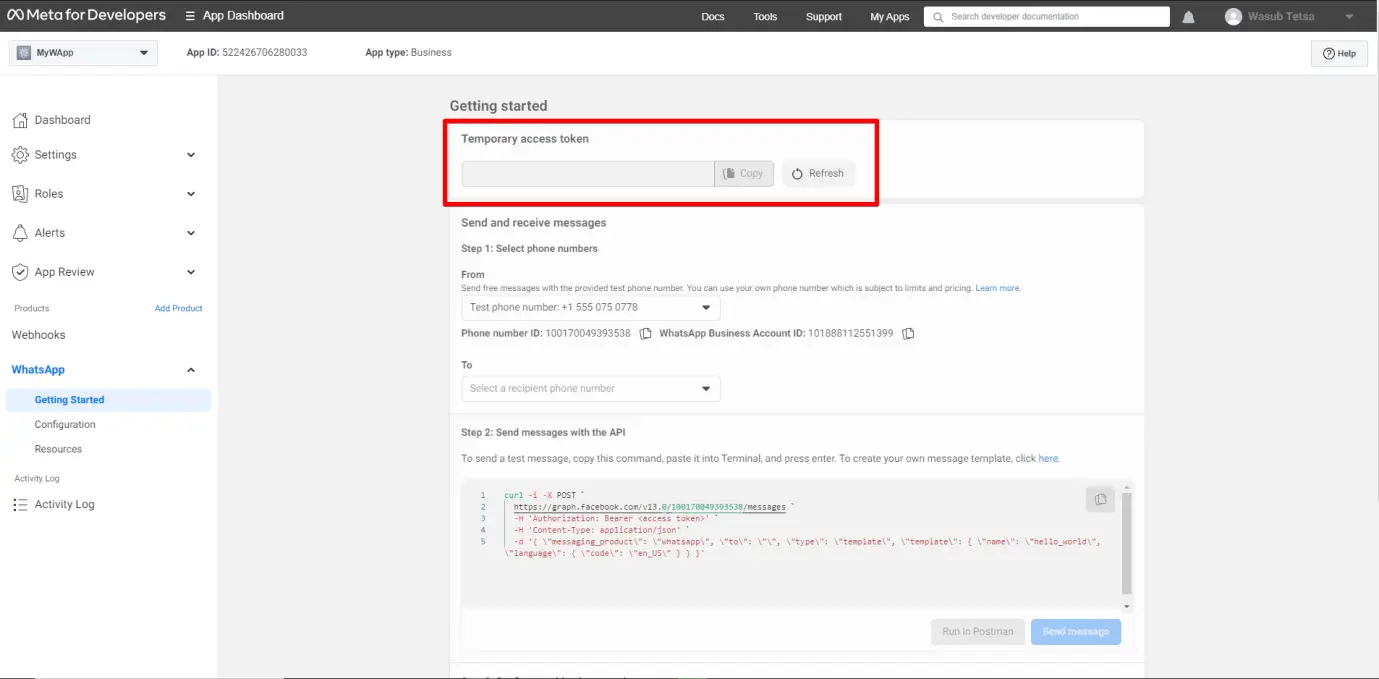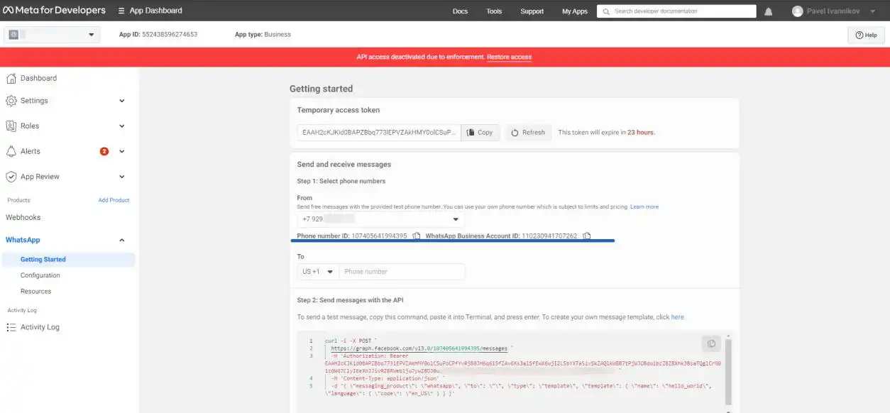 Esta pantalla contiene dos de los tres tipos de datos que el cliente necesita para conectar la API de WhatsApp Cloud a JivoChat