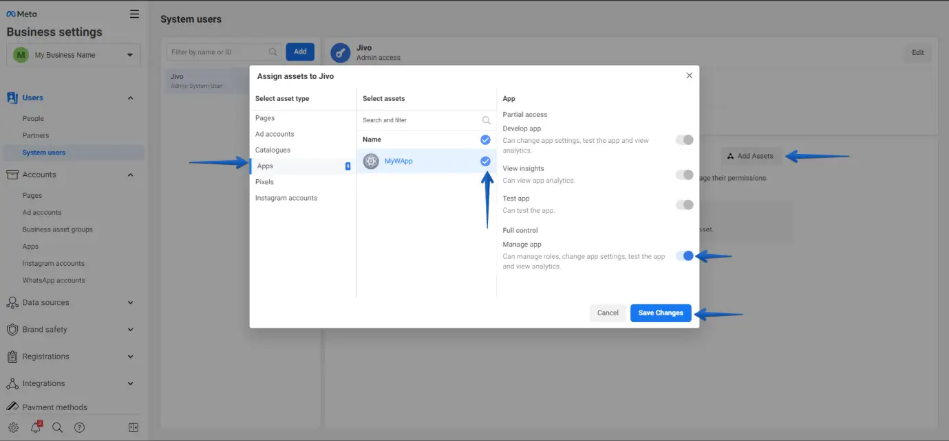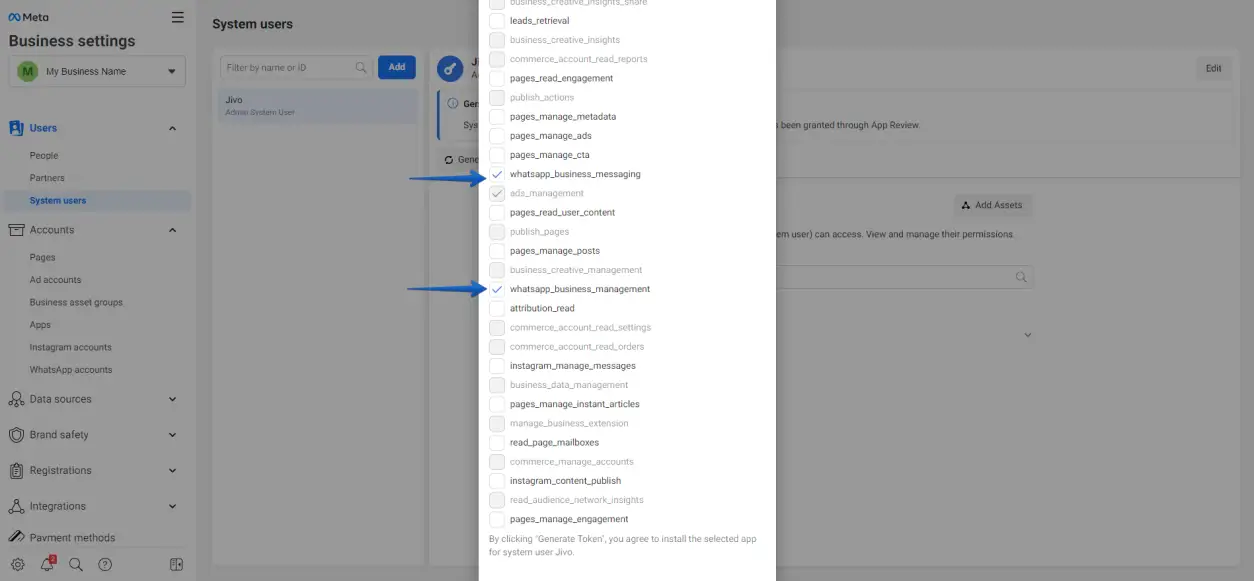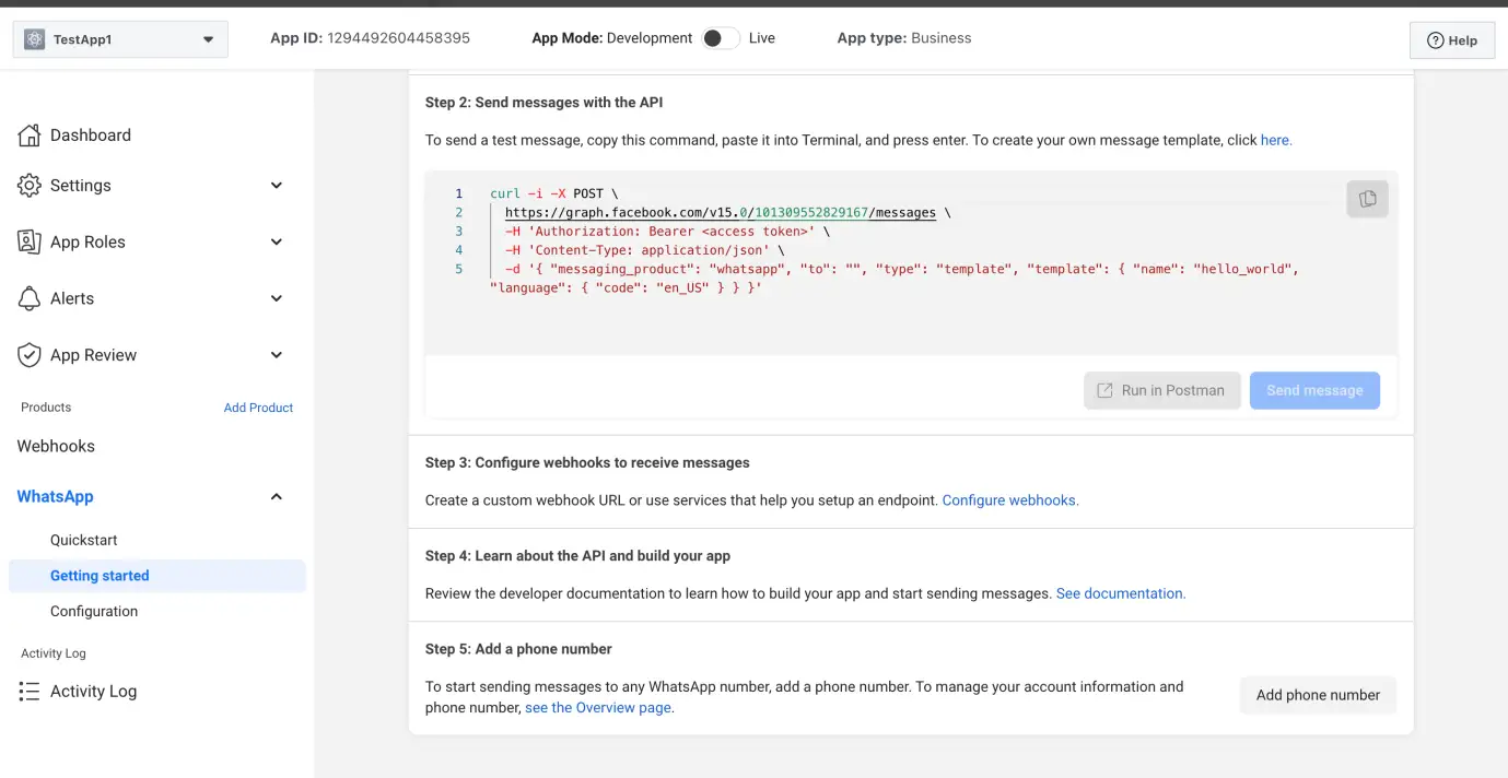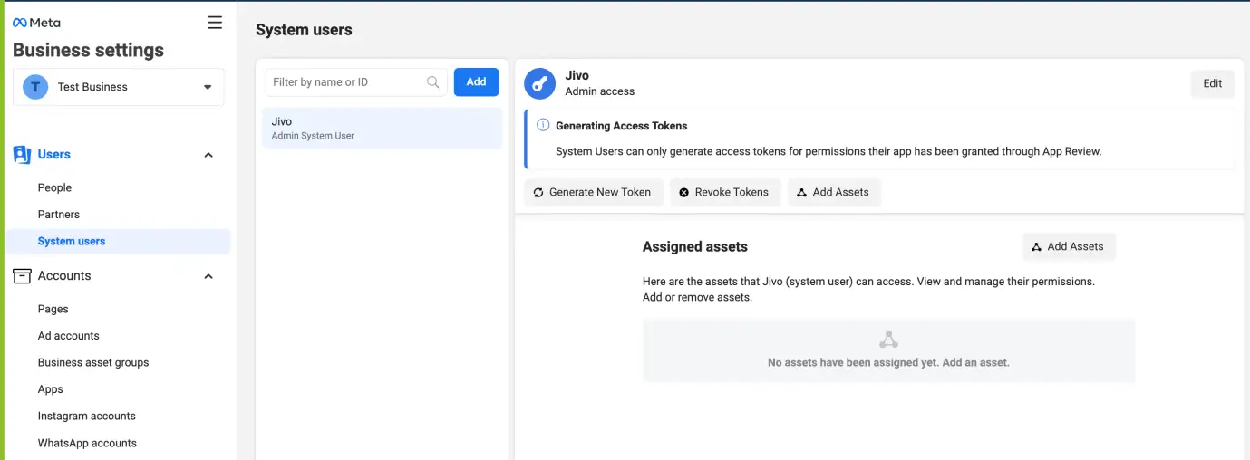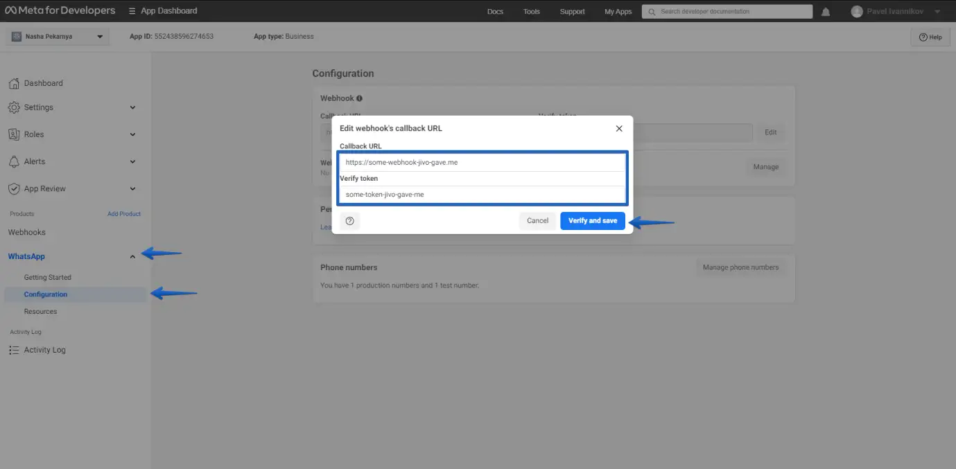 Esta pantalla contiene dos de los tres tipos de datos que el cliente necesita para conectar la API de WhatsApp Cloud a JivoChat