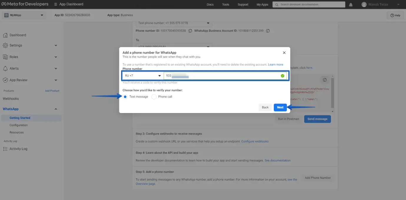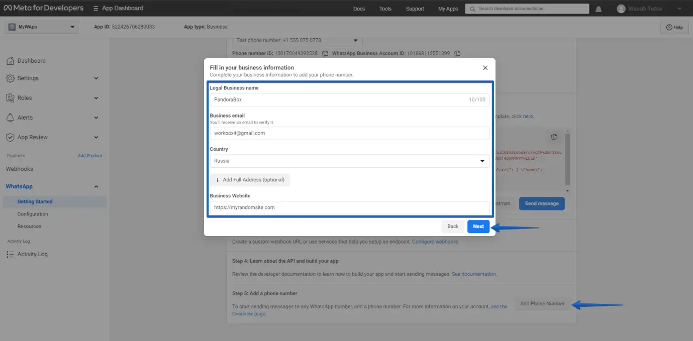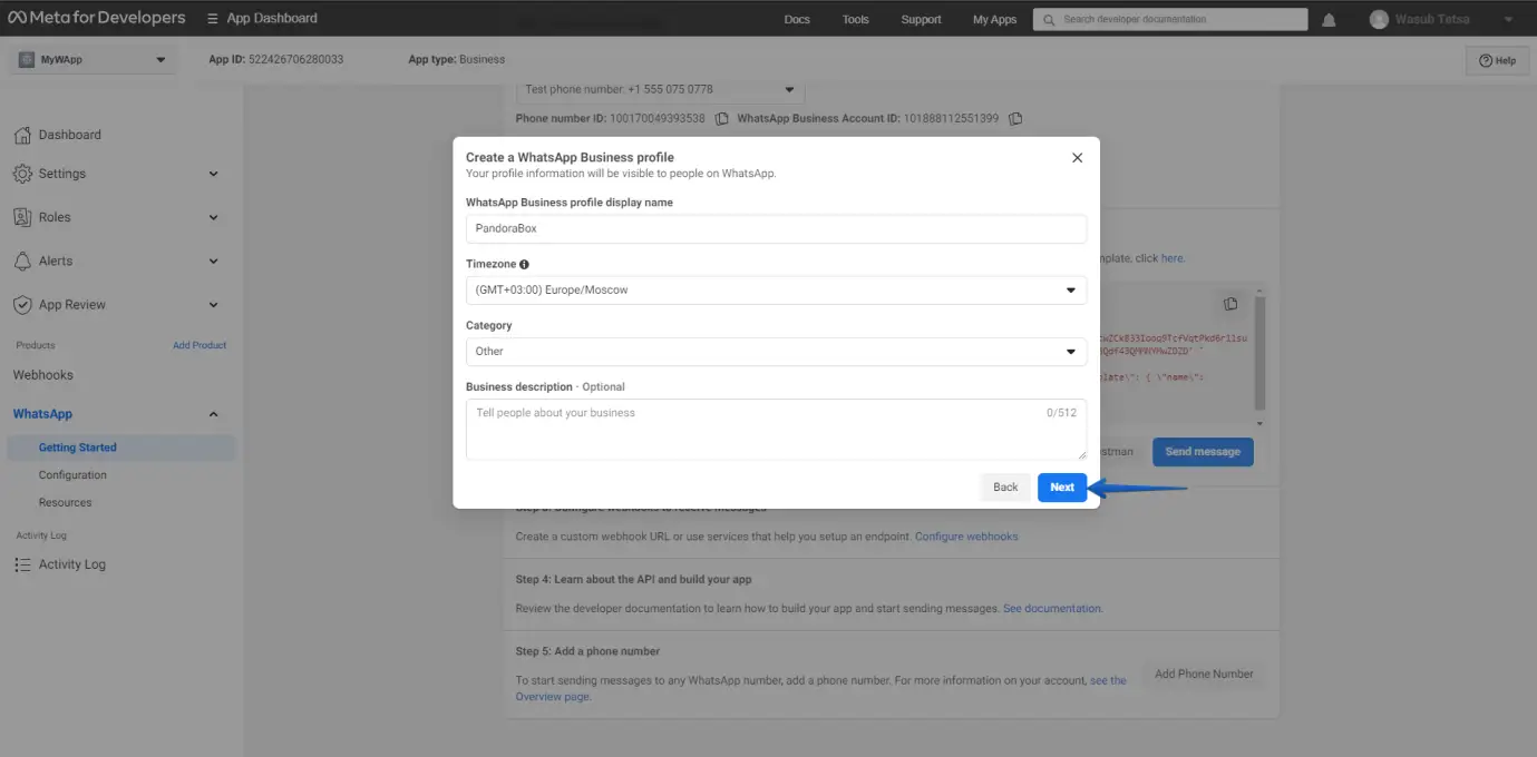 ID de número de teléfono, ID de cuenta comercial de WhatsApp