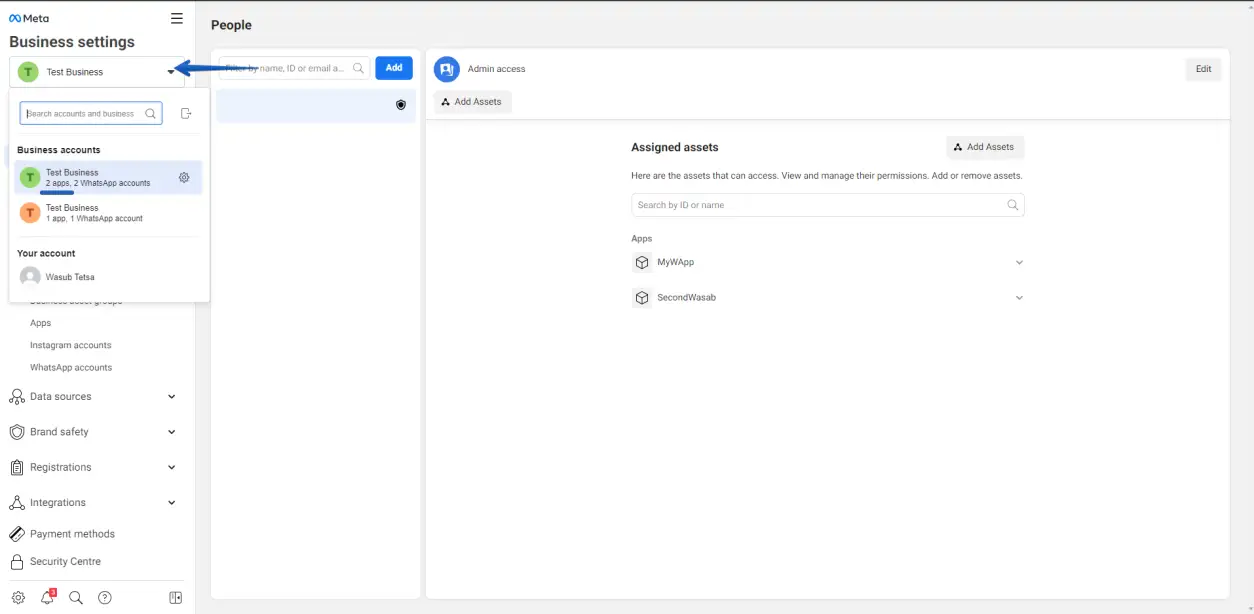 Puede tener varios negocios, por lo cual es importante elegir aquel sobre el que se creó la aplicación. Puede seleccionar de su lista: verifique el negocio que tiene la aplicación creada: