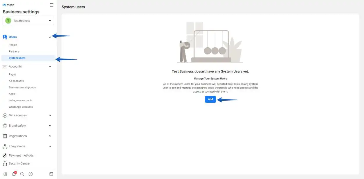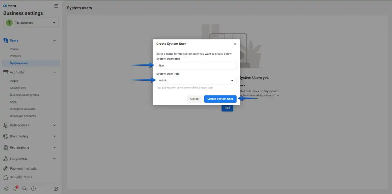 - Seleccione el negocio deseado y presione en la barra izquierda en "Users" -> "System users" -> "add":